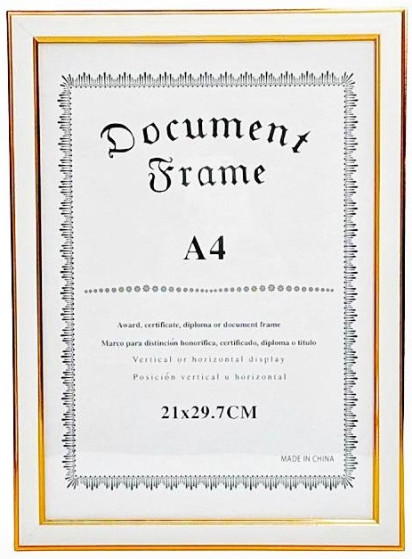 | Фоторамка пластик c оргстеклом А4 (21х30), Белая PS05W-A4-BR с золотым кантом